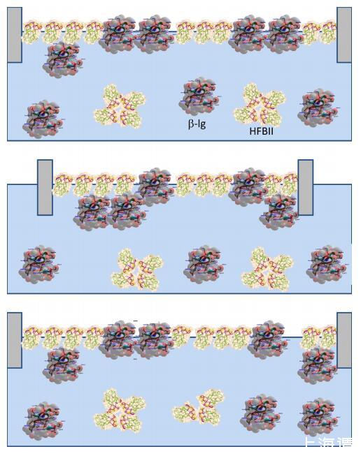 圖7。重復(fù)壓縮和膨脹后HFBII:WPI混合層結(jié)構(gòu)形成示意圖。請注意,乳清蛋白的主要成分BLG僅在此處顯示。壓縮:BLG的一部分從表面排出,形成一個子層。膨脹:BLG的一部分停留在亞表層,而另一部分可能重新吸附到主層。頂面存在HFBII的凈濃度。