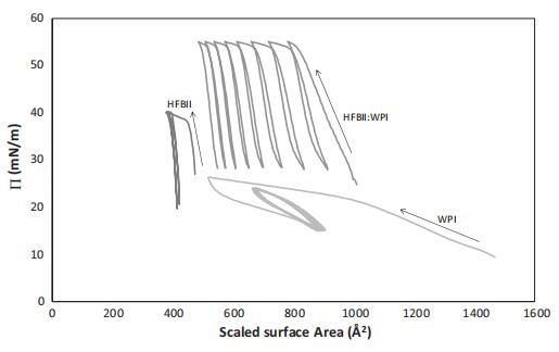 圖4。?/A-純HFBII、純WPI及其1:10混合物的吸附系統(tǒng)的等溫線,所有這些系統(tǒng)的總蛋白質(zhì)濃度均為0.1 mg/ml。等溫線包括第一個壓縮/膨脹循環(huán)和5個滯后環(huán)。將HFBII和WPI的表面積縮放至攤鋪系統(tǒng)曲線中彎曲點的出現(xiàn),對應(yīng)于表面的明顯緊密堆積過渡(圖1)。