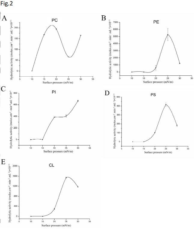圖2示出了使用各種磷脂作為水解底物獲得的詳細活性-表面壓力曲線??梢钥闯觯傅乃饣钚愿叨纫蕾囉诒砻鎵毫?。然而,每種底物的活性曲線不同。發現基板PE、PS和CL的鐘形曲線具有特征性的最佳表面壓力值(圖2B、D、E)。在低于15 mN/m的表面壓力下,未檢測到基本酶活性。水解活性隨表面壓力的增加而增加。在25 mN/m的表面壓力下,觀察到PE、PS和CL的最大活性。然而,當表面壓力高于25 mN/m時,所有這些磷脂的水解活性降低。與所有測試的底物相比,在25 mN/m的表面壓力下,PE的水解率最高,水解活性達到5272.31×10-11摩爾。cm-2。最小-1。mL-1。對于PI,在15 mN/m以下也沒有觀察到水解速率,但是,沒有觀察到鐘形曲線,并且隨著表面壓力從15 mN/m增加到30 mN/m,活性增強(圖2C)。對于PC,從10 mN/m到25 mN/m觀察到鐘形曲線,但在30 mN/m的表面壓力下,活性進一步增加。隨著表面壓力從25 mN/m增加到30 mN/m,表面輪廓上的單層構象可能發生了變化,導致活性增加。在本實驗中,在測試的表面壓力范圍內,SM沒有活性。從π-A曲線可以看出,在25 mN/m的表面壓力下測試的所有磷脂都處于液態冷凝狀態,沒有達到各自的坍塌壓力。在這種情況下,超卵磷脂酶對不同單分子磷脂膜的偏好順序為PE>CL>PS>PI>PC。在這些條件下,SM沒有活性。Lecitase Ultra選擇性的詳細機制仍需闡明。