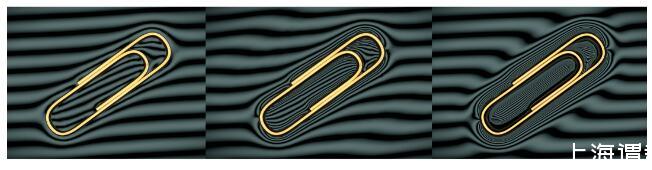 在這個(gè)例子中我們成功使密度大于水的回形針漂浮在水面上,水面下面的條狀背景會(huì)因?yàn)樗娴膹澢冃?,從左到右回形針的密度逐漸增大,中間條紋的密度也在逐漸增加。在最右邊的場(chǎng)景中,回形針的密度達(dá)到了7.9 g/cm^3(金屬鐵的密度),是水密度的將近8倍,但是依然可以依靠表面張力漂浮起來,得到的條紋分布與真實(shí)圖片最為接近。