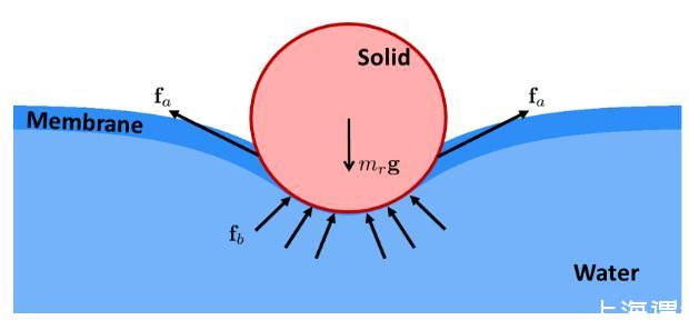 其中是流體表面的面積,稱為表面張力系數(shù)。當(dāng)流體與固體發(fā)生作用時(shí),流體表面的分子同時(shí)會(huì)受到固體分子的作用,從而將表面張力作用在固體上。固體根據(jù)表面特性不同可以分為親水和疏水兩類,疏水材質(zhì)在水面上會(huì)受到向上的表面張力作用,對(duì)于一些細(xì)小的結(jié)構(gòu)來說這個(gè)力要比浮力更為明顯。比如說水黽是一種可以生活在水面上的昆蟲,它的腳非常細(xì)長(zhǎng),并且有很多絨毛來保持疏水特性,因而水黽可以依靠表面張力維持自身的重量,并通過腳來劃動(dòng)水面來向前運(yùn)動(dòng)甚至跳起。