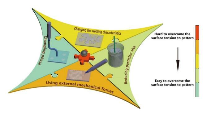 圖1克服液態金屬表面張力的四種策略及其成型的難易程度