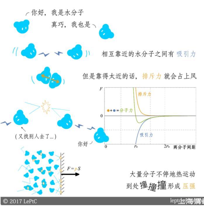 假設(shè)上下兩部分的壓強(qiáng)相同(壓強(qiáng)不同的情況將在第二節(jié)介紹),由于空氣對水分子的吸引力小于水分子之間的吸引力,所以位于表面的水分子會受到指向液體內(nèi)部的力,一部分水分子被拉進(jìn)液體內(nèi)部,表面層的水分子開始變稀疏,直到吸引力減弱到和空氣接近時趨于平衡。表面層水分子的間距大于r0,因此吸引力占上風(fēng):