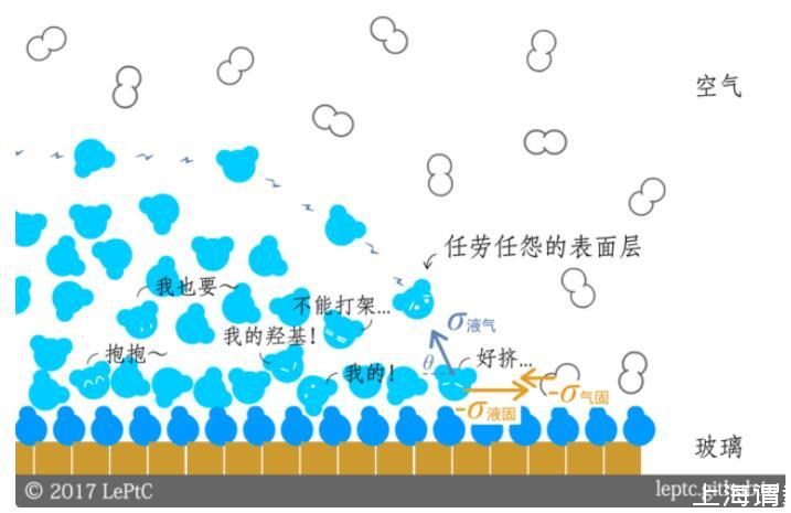 在氣體和液體之外,現(xiàn)在我們再加入新的角色——固體表面。玻璃的表面對水分子非常有吸引力(雖然玻璃的主要成分是二氧化硅,但它的表面通常會因為價態(tài)不飽和而結(jié)合很多羥基)。如果水滴碰到的界面是玻璃,就會出現(xiàn)跟空氣相反的情況:接觸面的水分子比平衡時更擠,表面張力是擴(kuò)張的,表面能是負(fù)的,整坨水滴會希望自己跟玻璃的接觸面積越大越好(同時跟空氣接觸面積越小越好),形成特定的接觸角θ。這個角越小,意味著固體表面的親水性越強(qiáng)。