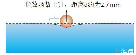 我們由水面上兩個球形的物體做理想分析,現在先看親水的球形的物體在水面上使水面升高的情形。如圖1所示,親水物體由于其毛細作用,附近水面上升,不過水面升高后以指數函數在兩側下降,其影響距離大致為毛細作用力的距離,即2.7 mm。大于2.7 mm時,重力與表面張力相比重力占據主導地位,液面幾乎不再上升。