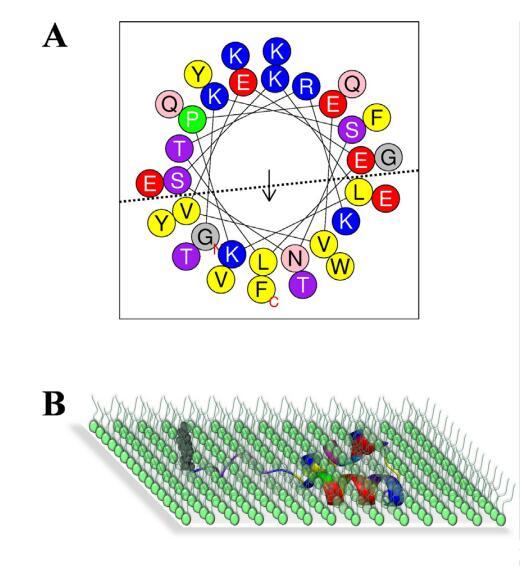 圖8.(A)使用在線工具Heliquest[78]建立的N-末端肽的螺旋輪表示法。顏色代碼如下:疏水殘基為黃色,絲氨酸和蘇氨酸為紫色,堿性殘基為藍(lán)色,酸性殘基為紅色,天冬酰胺和谷氨酰胺為粉紅色,脯氨酸為綠色,其他殘基為灰色。(B)在存在脂質(zhì)單層的情況下N-末端肽的方向的圖示。使用與(A)相同的顏色代碼(為了解釋本圖例中對顏色的引用,讀者請參閱本文的web版本)。