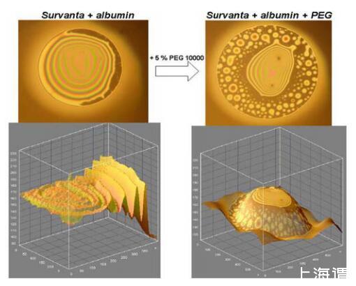 當通過Survanta和白蛋白添加到混合FFs中時,葡聚糖不會改變膜的性質。然而,當FFs中包含PEG 10000時,富含白蛋白的厚膜分解成更小的厚“島”,島之間有薄的(h=17 nm)黑色區域(圖4)