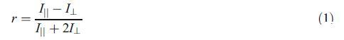 所有熒光各向異性測量均在25.0±0.2°C下使用來自美國的熒光偏振儀器系統(tǒng)(Beacon-2000)進(jìn)行。該儀器配備了100W鹵素?zé)糇鳛榧ぐl(fā)源。羅丹明B(RB)作為熒光探針,其濃度保持在1μM。我們還在12mM純表面活性劑濃度下進(jìn)行了10 nM至2μM探針濃度的各向異性測量(數(shù)據(jù)未顯示)。選擇飽和r值(探針完全與膠束結(jié)合)下的探針濃度(1μM)作為實驗條件。純和二元混合物的表面活性劑總濃度為12mM。分別使用570和630nm的激發(fā)和發(fā)射波長測量熒光各向異性。當(dāng)發(fā)射偏振器平行或垂直于偏振激發(fā)方向定向時?,分別地各向異性是強度差I(lǐng)kI的比率?總強度Ikt2I?如等式1所示: