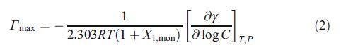 其中γ、C、R、T、P和X1、mon分別為界面張力、表面活性劑濃度、理想氣體常數(shù)、溫度、壓力和陽離子表面活性劑(HTPB)的單層組成。在等式2中,我們考慮了界面處反離子的吸附,以計算Γmax。界面上表面活性劑物種占據(jù)的平均最小面積Amin然后通過以下方程進(jìn)行評估: