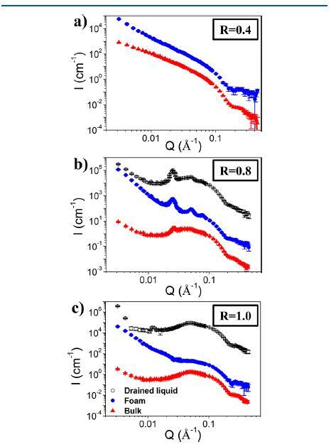 泡沫液體通道內(nèi)的自組裝是摩爾比的函數(shù)。為了制備泡沫,我們選擇了三種摩爾比R,在15°C下,存在三種不同的自組裝結(jié)構(gòu):多面囊泡(R=0.4)、層狀相和膠束之間的混合物(R=1.8)和球形膠束(R=2.0)。42我們使用SANS實(shí)驗(yàn)來(lái)探測(cè)泡沫并確定泡沫液體通道內(nèi)存在的自組裝體。43泡沫的散射強(qiáng)度如圖2所示。為了比較泡沫中存在的自組裝和體中的自組裝,我們還繪制了制備泡沫的體散射光譜。