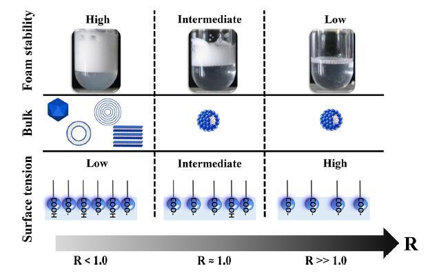 圖6.說明摩爾比(R)、泡沫穩(wěn)定性、本體自組裝和表面性質(zhì)之間聯(lián)系的示意圖。