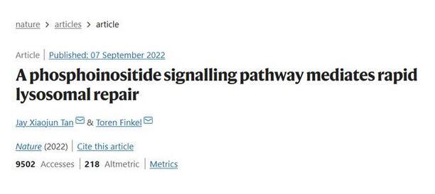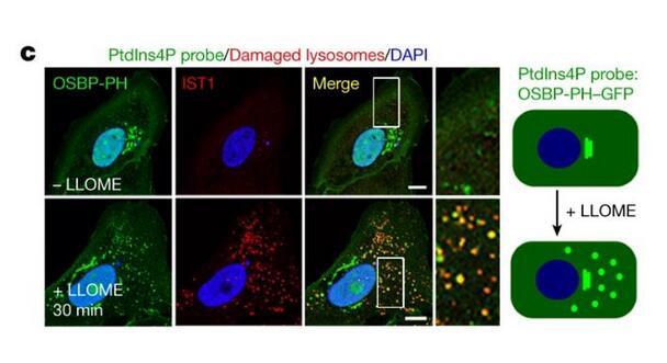 9月7日,來自匹茲堡大學醫學院細胞生物學系的譚小軍博士與衰老研究所所長Toren Finkel博士在《自然》(Nature)雜志發表了一篇題為“A phosphoinositide signalling pathway mediates rapid lysosomal repair”的細胞生物學領域研究論文。研究者們通過一系列實驗,首次描述了一種溶酶體修復的核心途徑:PITT途徑(phosphoinositide-initiated membrane tethering and lipid transport)。通過該途徑,細胞能快速修復已受損的溶酶體。該發現將協助人們進一步了解和治療由溶酶體受損驅動的與年齡相關的疾病。