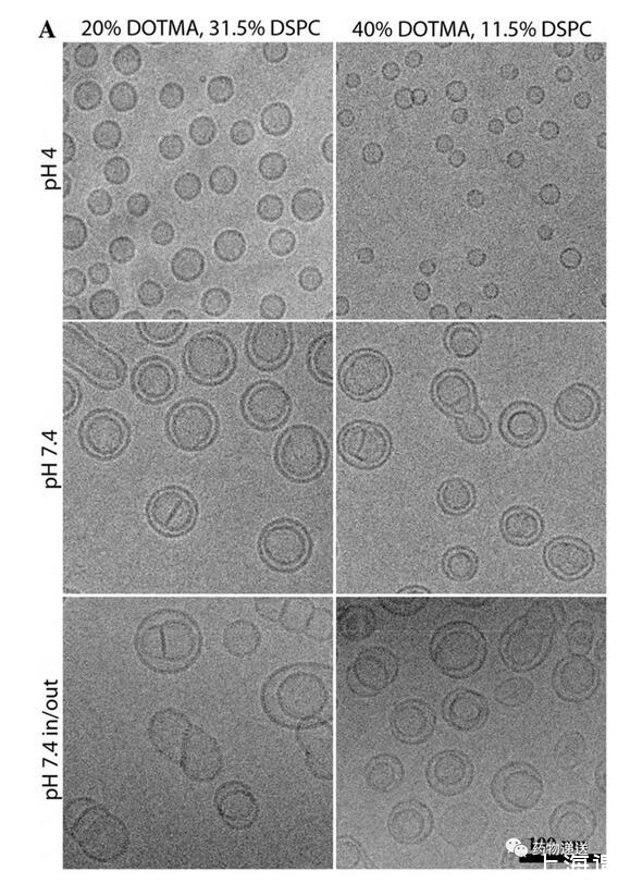 此外還發現,采用乙醇稀釋/快速混合技術制備LNP-siRNA,當siRNA含量較高時,表現為堆疊的小雙層結構,其中siRNA被包載于緊密相連的脂質雙分子層之間;當siRNA含量較低時,堆疊結構的比例降低,LNP-siRNA復合物系統則表現出siRNA雙層結構和非晶態電子致密核的組合,這可能是由中性形式的可電離陽離子脂質產生的油滴而形成。所得結論為:含可電離陽離子脂質的LNP體系在pH=4時形成雙層結構,在pH=7.4時形成非晶態“固體核”結構。