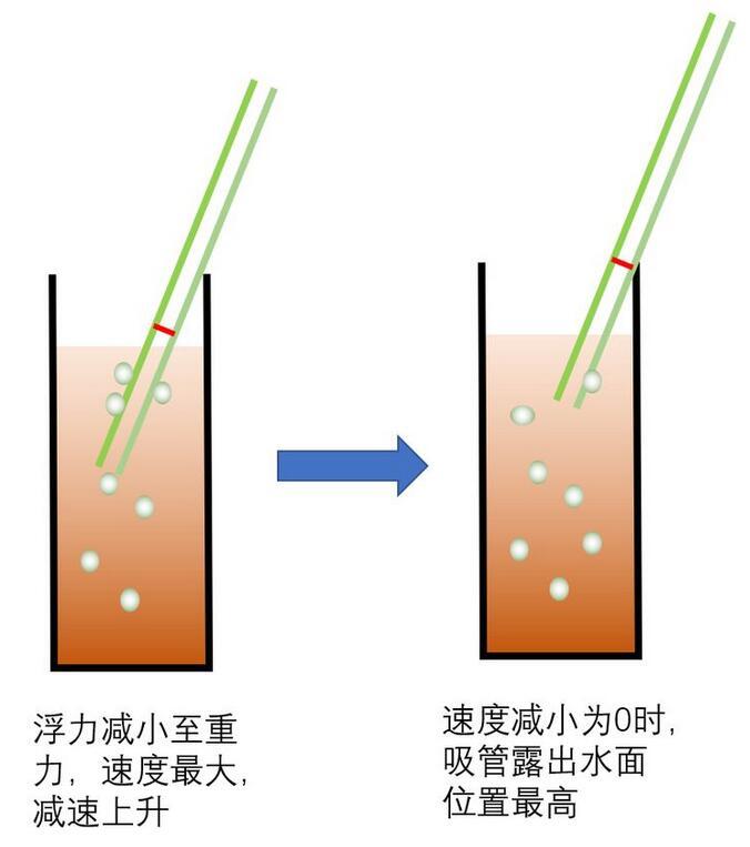 這時(shí)上升過(guò)程中,吸管可能因?yàn)樽笥覂蓚?cè)吸附的氣泡數(shù)量不同而發(fā)生浮力差異而傾斜。也可能因?yàn)橥饨鐢_動(dòng)而發(fā)生傾斜,反正吸管豎直上升的可能性很小。習(xí)慣傾斜碰到瓶壁后繼續(xù)上升,上升帶來(lái)氣泡的減少,吸管自身浮力的下降。當(dāng)浮力減小到小于重力時(shí),這時(shí)開(kāi)始i減速,直到速度為零。如下圖所示;