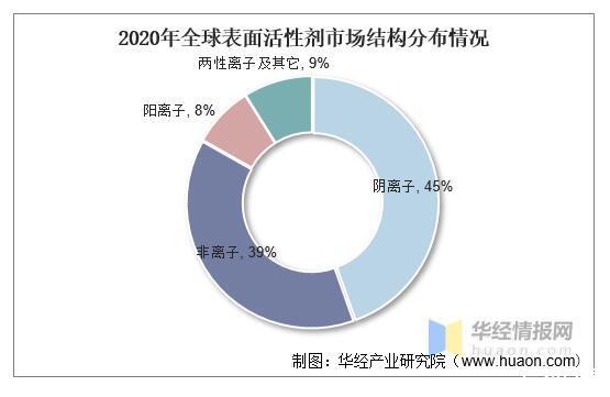 從市場結(jié)構(gòu)來看,2020年全球表面活性劑市場中,陰離子和非離子是其最主要的細分領(lǐng)域,占比分別為45%和39%,陽離子和兩性離子及其它占比分別為8%和9%。
