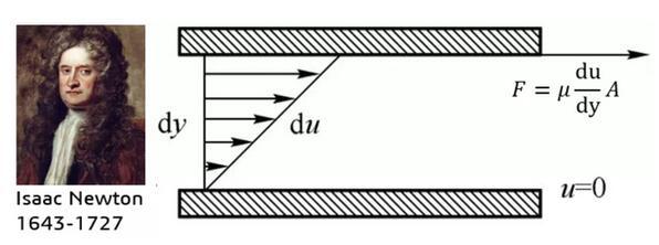 正如前面所說,人們很早便感受到了流體具有“粘”的屬性,但是如何從科學上表達流體的粘性成為了一個新的問題。作為世界物理學界金字塔尖的男人,牛頓幾乎霸屏了整個中學物理課本,當然也沒有放過流體。1686年,牛頓經(jīng)過大量的實驗研究,提出了著名的“內(nèi)摩擦定律”——流體的內(nèi)摩擦力(即粘性力)的大小與流體的性質(zhì)(粘性系數(shù)μ)有關,并與流體的速度梯度和接觸面積成正比。