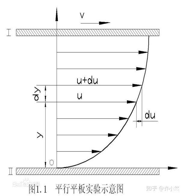 在這張圖中,下方的平板和兩個平板間的液體保持相對靜止,且液體內部沒有對自身體內不同質點的相對流動,而將上方平板做水平向右的推動。可以看見,在與上方平板直接接觸的一層液面處可以達到與被推動的平板相同的速度,而在垂直距離上越遠離上層平板的部分的速度越慢,直到最下層與下方平板直接接觸的液面處速度為零,在兩個平板之間存在一個連續變化的速度分布。