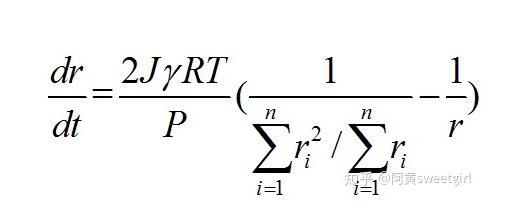 假設氣體符合氣體理想氣體方程,即PV=nRT,對于球形氣泡,體積V=4πr^3/3,從而可把摩爾速率轉化為氣泡半徑變化的速率。通過以上各式,可得