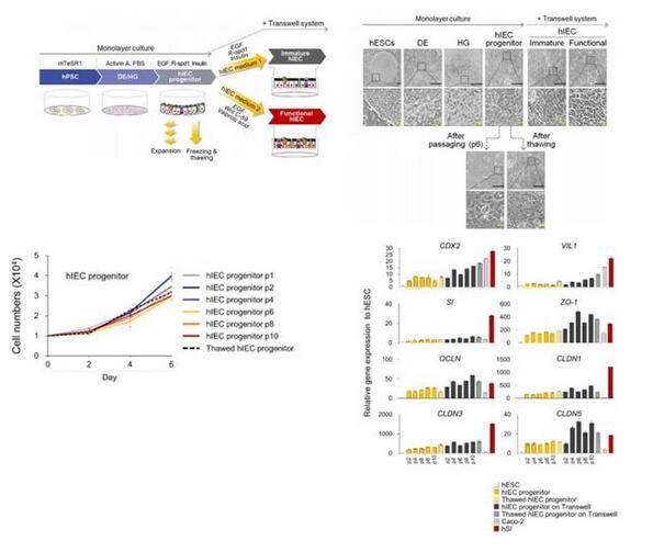 鑒于此,韓國(guó)生命工學(xué)研究院的一項(xiàng)研究開發(fā)了一種重復(fù)性良好的兩步方法來誘導(dǎo)人多能干細(xì)胞分化為可擴(kuò)大的hIEC祖細(xì)胞和具有功能性的hIEC單層細(xì)胞。