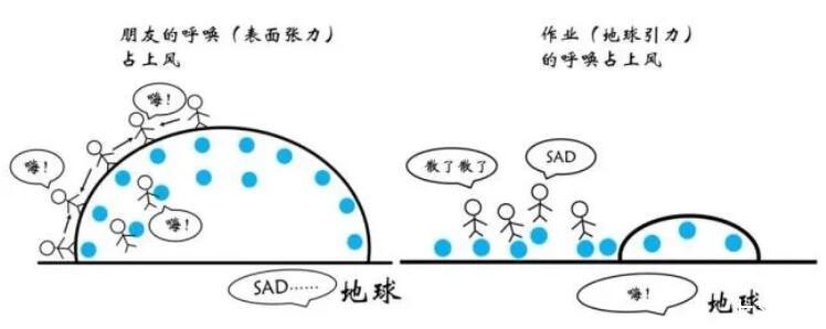 重力的作用希望每個水分子都處在盡可能低的地方,顯然呈現近似球形的形狀并不是重力勢能最低的情況。因此,表面張力與重力之間便存在著競爭。