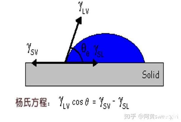 聚合物為固體時(shí),它的表面張力的測(cè)定就沒(méi)那么簡(jiǎn)單了。根據(jù)不同的情形,有幾種不同的方法去測(cè)定。一種容易理解的方法是使用兩種液體在固體表面上分別測(cè)出接觸角,分別建立楊氏方程,然后聯(lián)立楊氏方程消除未知量。楊氏方程如下: