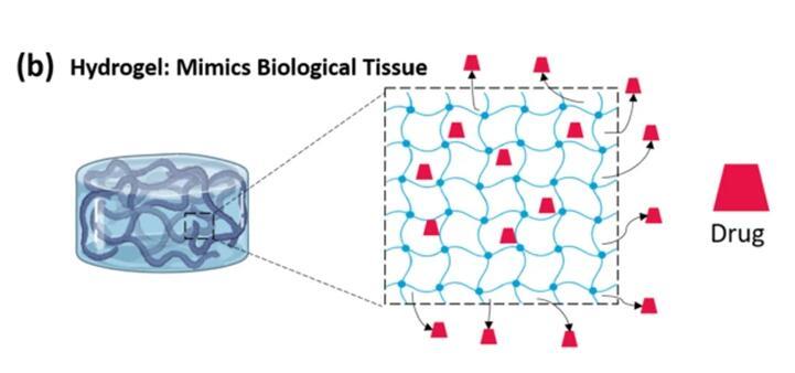 水凝膠是通過物理或化學交聯(lián)方法形成的三維聚合物網(wǎng)格。網(wǎng)格之間留有一定的空間,由于該網(wǎng)格的存在,水凝膠的結(jié)構(gòu)富含多孔性。聚合物網(wǎng)格可以截留大量的水,并防止其運輸?shù)酵獠凯h(huán)境,從而模仿生物組織的物理特性。這種保水能力,使水凝膠能夠提供良好的生物相容性和封裝藥物分子的平臺。該網(wǎng)格可以限制不同酶的滲透,從而保護包封的藥物免受各種酶降解。