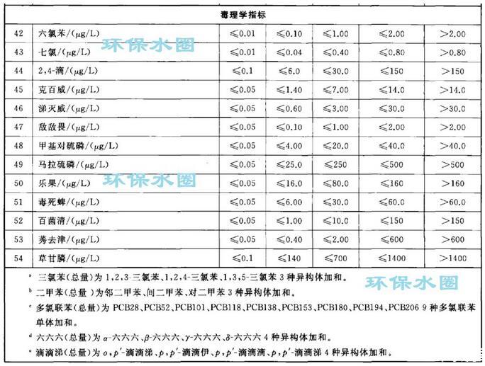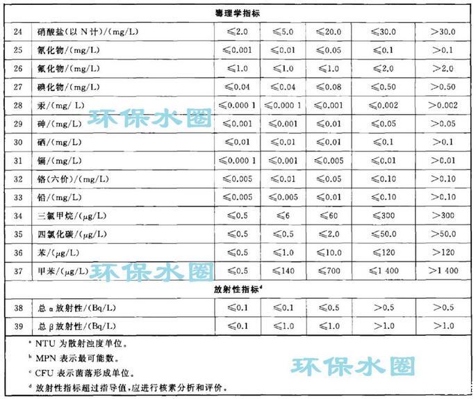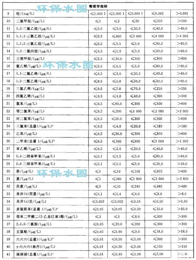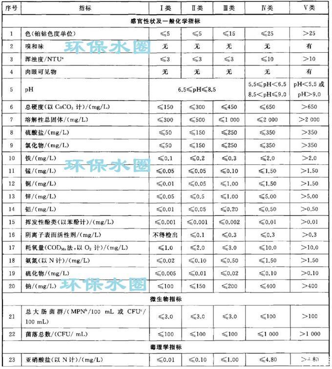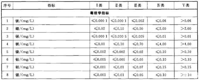 依據(jù)我國地下水質(zhì)量狀況和人體健康風(fēng)險,參照生活飲用水、工業(yè)、農(nóng)業(yè)等用水質(zhì)量要求,依據(jù)各組分含量高低(pH除外),分為五類。