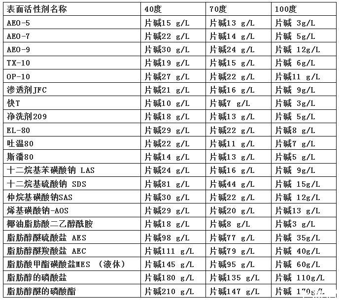 目前常見的表面活性劑耐堿性能如下表: