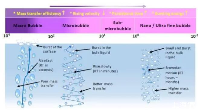氣泡表面積和氣泡直徑呈負相關(guān)關(guān)系,(表面積A和直徑D的數(shù)學關(guān)系A(chǔ)=6/D)。因此同樣體積的氣泡,100納米直徑氣泡表面積是10微米直徑面積的100倍。