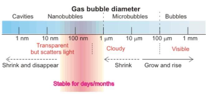 氣泡分類不僅根據(jù)大小,而且根據(jù)其特征和在液體中的行為。圖1對不同氣泡大小的分類進行了匯總。1-10微米氣泡其大小和特征都介于微米氣泡和納米氣泡之間,被歸類到亞微米氣泡。雖然學術(shù)界對微米氣泡的特征有一致看法,但是對氣泡的大小范圍沒有統(tǒng)一標準。