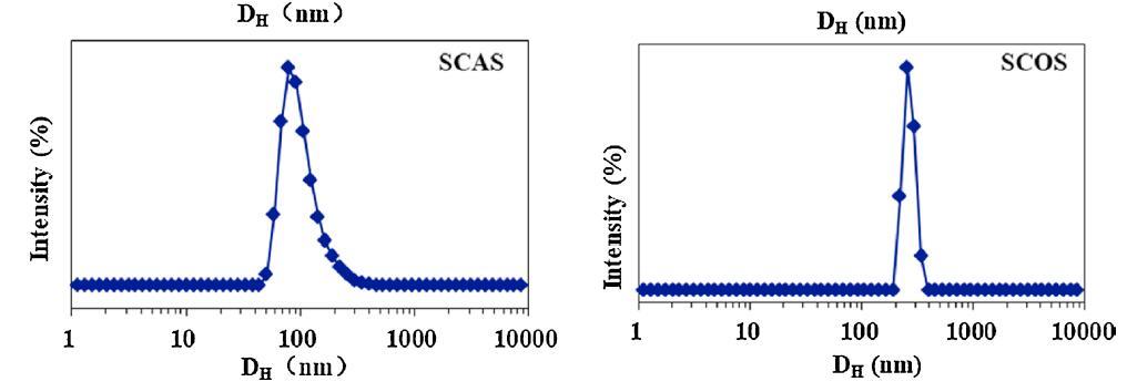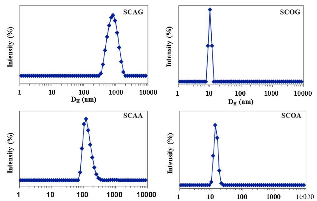 用DLS測量在6種?;被岜砻婊钚詣┧芤褐行纬傻木奂w的大小和分布,其CMC為5倍,5×CMC。圖2顯示了它們的表觀等效流體動力學直徑(DH)。除絲氨酸外,蓖麻油表面活性劑的DH分布普遍大于棉籽油表面活性劑的DH分布。SCAG和SCAA的DH分布分別集中在900和150 nm,而SCOG和SCOA聚集體的直徑約為10 nm。對于絲氨酸,SCAS和SCOS的平均DH值分別約為100 nm和250 nm。這些結果可以通過蓖麻油衍生的表面活性劑的蓖麻油基和絲氨酸頭部基團上都存在-OH基團來解釋,促進了大聚集體,例如囊泡的形成(圖2)。