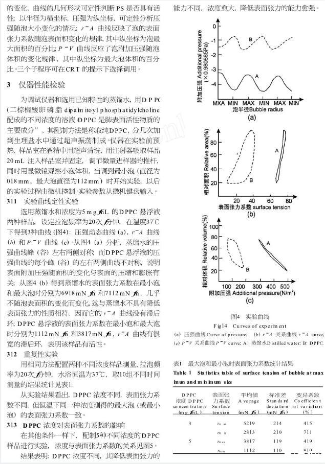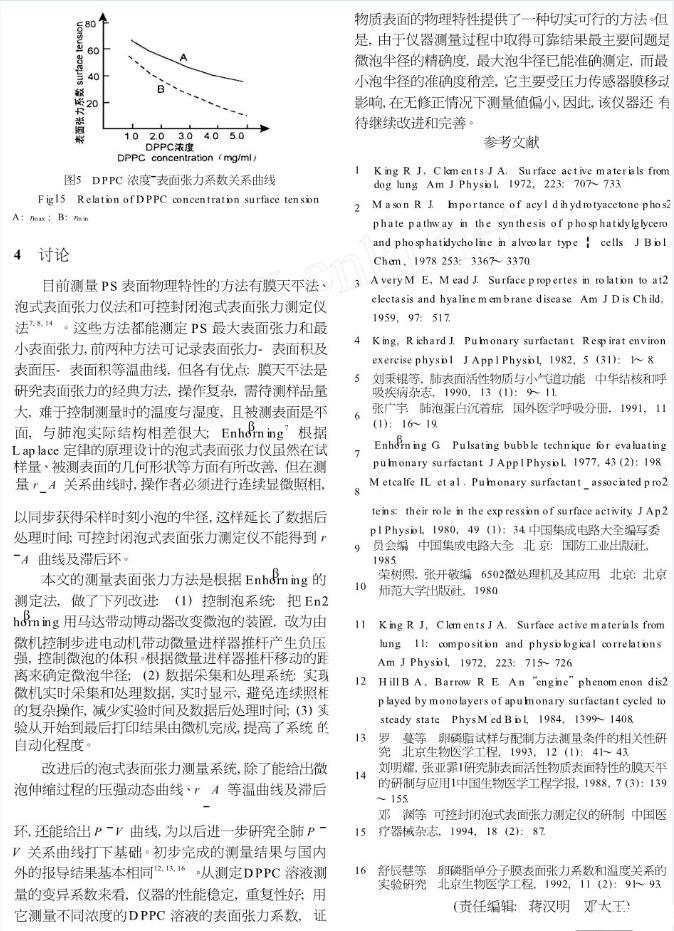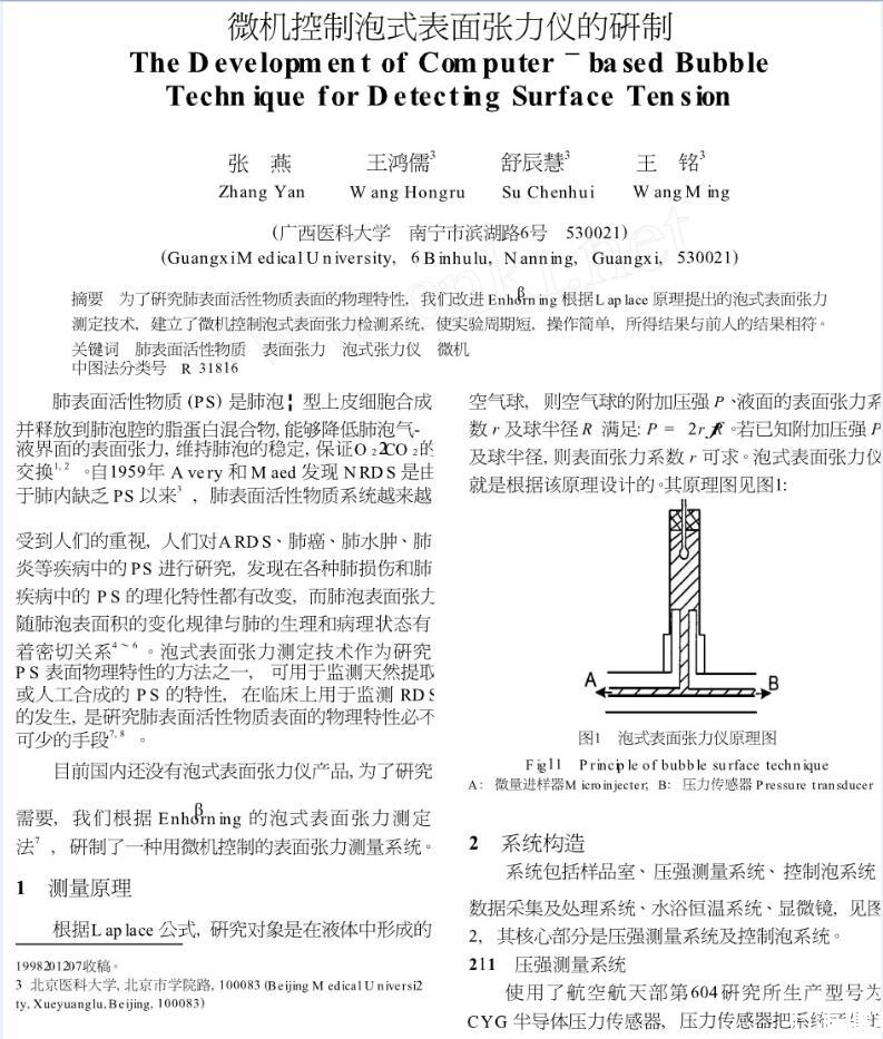 為了研究肺表面活性物質表面的物理特性,我們改進Enhorning根據(jù)Laplace原理提出的泡式表面張力測定技術,建立了微機控制泡式表面張力檢測系統(tǒng),使實驗周期短,操作簡單,所得結果與前人的結果相符。