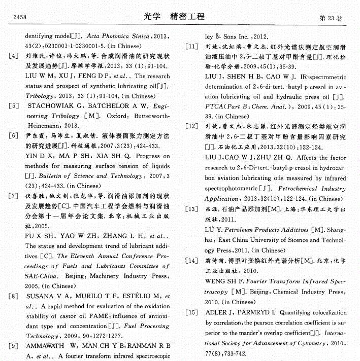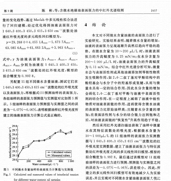 【摘要】:為了有效監(jiān)控絕緣油的運行狀態(tài),采用定量分析方法探討了微量水分對絕緣油表面張力的影響規(guī)律。通過配制不同微水含量的絕緣油樣,對每組油樣進行表面張力測試,然后對油樣進行紅外光譜掃描,獲取了油樣中水分在特征波數(shù)處(1 640,3 400,3 450,3 615cm-1)的吸光度值。分析了油液中2,6-二叔丁基對甲酚(T501)等添加劑對油樣表面張力變化規(guī)律的影響。結(jié)果表明:油樣中水分含量與水分特征吸光度值之間有較好的相關(guān)性(相關(guān)系數(shù)分別為0.964 1,0.984 8,0.984 5,0.944 0),油樣表面張力和1 640,3 400,3 450,3 615,3 650cm-1波數(shù)處油樣吸光度值的變化亦均呈現(xiàn)良好的正相關(guān)性。建立了油樣表面張力與特征波數(shù)處油樣吸光度值的多元線性回歸模型,擬合精度為0.992 8;根據(jù)模型得到的表面張力計算值與實際測量值誤差為-0.07~0.06%,吻合性較好。文中的實驗可為含微水絕緣油的表面張力檢測提供理論支撐。