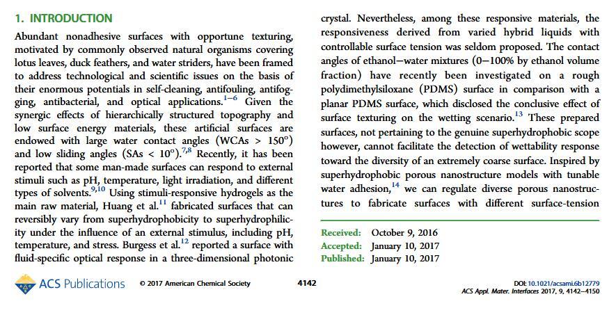 當液體的表面張力發生變化時,它在普通固體表面的潤濕性也會隨著變化。然而,關于這一規律以及尤其是在超疏水表面的表現的研究很少。最近,協同創新中心PI-6管自生老師課題組研究生王研等人利用上述的表面張力和潤濕性的響應關系首次將透明超疏水涂層應用在探測液體表面張力方面,為拓寬多功能超疏水涂層的應用提供了一個新的思路,相關論文已被ACS applied materials&interfaces發表。研究表明,隨著有機物水溶液中有機物體積分數上升,溶液的表面張力相應地下降,溶液液滴在制備的超疏水涂層的接觸角也逐漸下降,此稱之為表面潤濕性對表面張力的響應?;诖隧憫P系,可以通過接觸角估測液體的表面張力以及有機物的濃度。