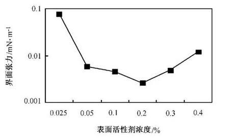 界面張力隨著表面活性劑濃度的增加先減小后略有增加。這是由于表面活性劑在濃度較低時(shí),在油水界面上吸附的分子較少,分子排列不夠緊密且不規(guī)則,界面張力較大;濃度增大時(shí),油水界面上吸附的分子逐漸增多,分子排列變得緊密而整齊,達(dá)到吸附飽和,界面張力急劇下降;繼續(xù)增大表面活性劑的濃度時(shí),在油滴附近開始出現(xiàn)膠團(tuán),阻止了部分表面活性劑在油水界面的吸附,界面張力開始回升。