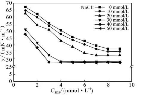 三種無機鹽的加入可以降低表面張力;當NaCl、CuCl2,Fe(NO3)3的濃度在40,1.25,1.25 mmol/L以下范圍內,在一定量SDS表面活性劑溶液濃度下,隨著無機鹽濃度的增加,表面張力逐漸減小;當超過無機鹽添加濃度上限后,在一定量的SDS表面活性劑溶液濃度下,隨著無機鹽濃度的增加,表面張力將達到穩定。同時,無機鹽濃度的增加可以降低表面張力達到最低時所對應的SDS表面活性劑溶液濃度值(Ct),各體系下的Ct即為cmc值,當三種無機鹽添加濃度達到上限值后,表面張力達到最小值時所對應的SDS表面活性劑溶液濃度都是3 mmol/L,加入Fe(NO3)3、CuCl2和NaCl之后,溶液的表面張力由37.29 mN/m分別降至21.35,23.44,27.53 mN/m。