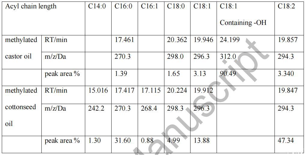 結果見表1。從表1可以看出,蓖麻油含有 蓖麻醇酸酯含量更高(90.49%),最突出的成分 棉籽油的主要成分是亞油酸酯 (47.34 %),其次是棕櫚酸酯 (31.60 %) 和 油酸酯(13.88%)。 所以蓖麻油和棉籽油的平均分子質量 分別為 926 和 854。