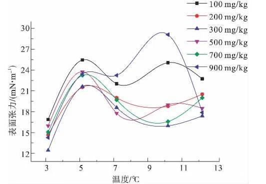 圖5為100、200、300、500、700、900 mg/kg濃度下,陰離子表面活性劑CTAB溶液的表面張力隨溫度變化示意圖。由圖5可知,300 mg/kg溶液的表面張力曲線最低,說明該濃度的溶液表面活性最強。在所測溫度范圍內(nèi),隨溫度升高表面張力變化較大,整體上表面張力曲線呈波浪狀,出現(xiàn)拐點。6條曲線在3℃時均出現(xiàn)最低表面張力值,在5℃附近均出現(xiàn)波峰;100、500和900 mg/kg溶液在7℃附近時出現(xiàn)波谷,10℃附近再次出現(xiàn)波峰;200、300和700 mg/kg溶液在10℃附近出現(xiàn)波谷。