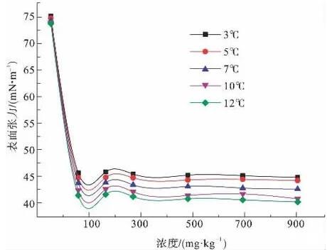 圖2為3、5、7、10、12℃下,陰離子表面活性劑CTAB溶液的表面張力隨濃度變化示意圖。由圖2可知,CTAB是比較優(yōu)良的表面活性劑,在低濃度下就能夠顯著降低溶液表面張力,在300 mg/kg-1時表面張力達到最低值,之后隨濃度增大,表面張力變化不大,因此CTAB的臨界膠束濃度CMC即在此濃度范圍附近。在所測溫度范圍內(nèi),當CTAB溶液達到CMC以后,表面張力值在14.5~23.5 mN/m之間。隨溫度變化,表面張力值相差較大。