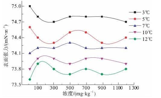 圖7為100、300、500、700、900、1 200 mg/kg濃度下,本實驗自行合成的離子液體[HMIPS]Ss溶液的表面張力隨溫度變化示意圖。在低溫區(qū)間內(nèi)300 mg/kg溶液的表面張力曲線最低,說明該濃度的溶液表面活性最強。在所測溫度范圍內(nèi),整體上表面張力曲線遵循隨溫度升高而表面張力降低的一般規(guī)律,但相差不大,同一條曲線3℃和12℃表面張力值相差0.9~1.1 mN/m。